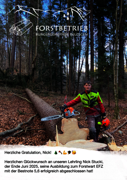 Herzlichen Glückwunsch an unseren Lehrling Nick Stucki, der Ende Juni 2025, seine Ausbildung zum Forstwart EFZ mit der Bestnote 5,6 erfolgreich abgeschlossen hat!
